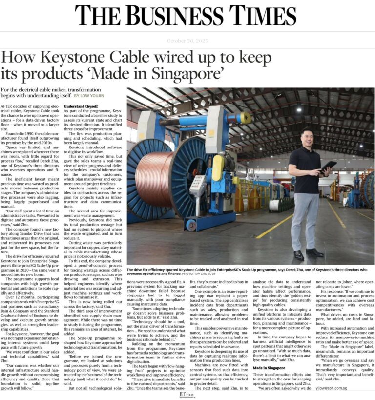 Keystone Cable was featured in The Business Times, highlighting its journey of digital transformation and ongoing commitment to strengthening manufacturing roots in Singapore.